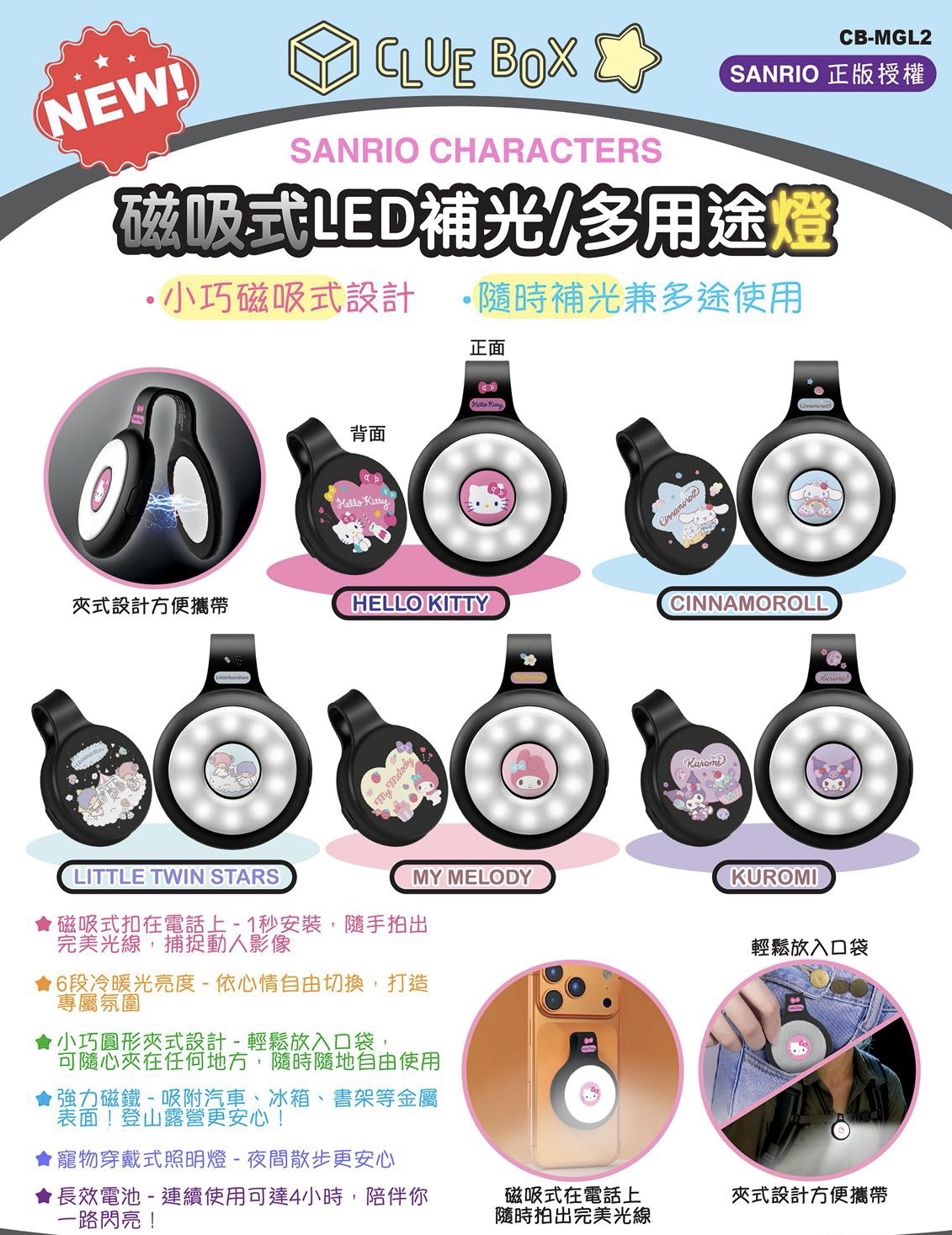 新品登場 - CLUE BOX SANRIO CHARACTER 磁吸式LED補光/多用途燈
