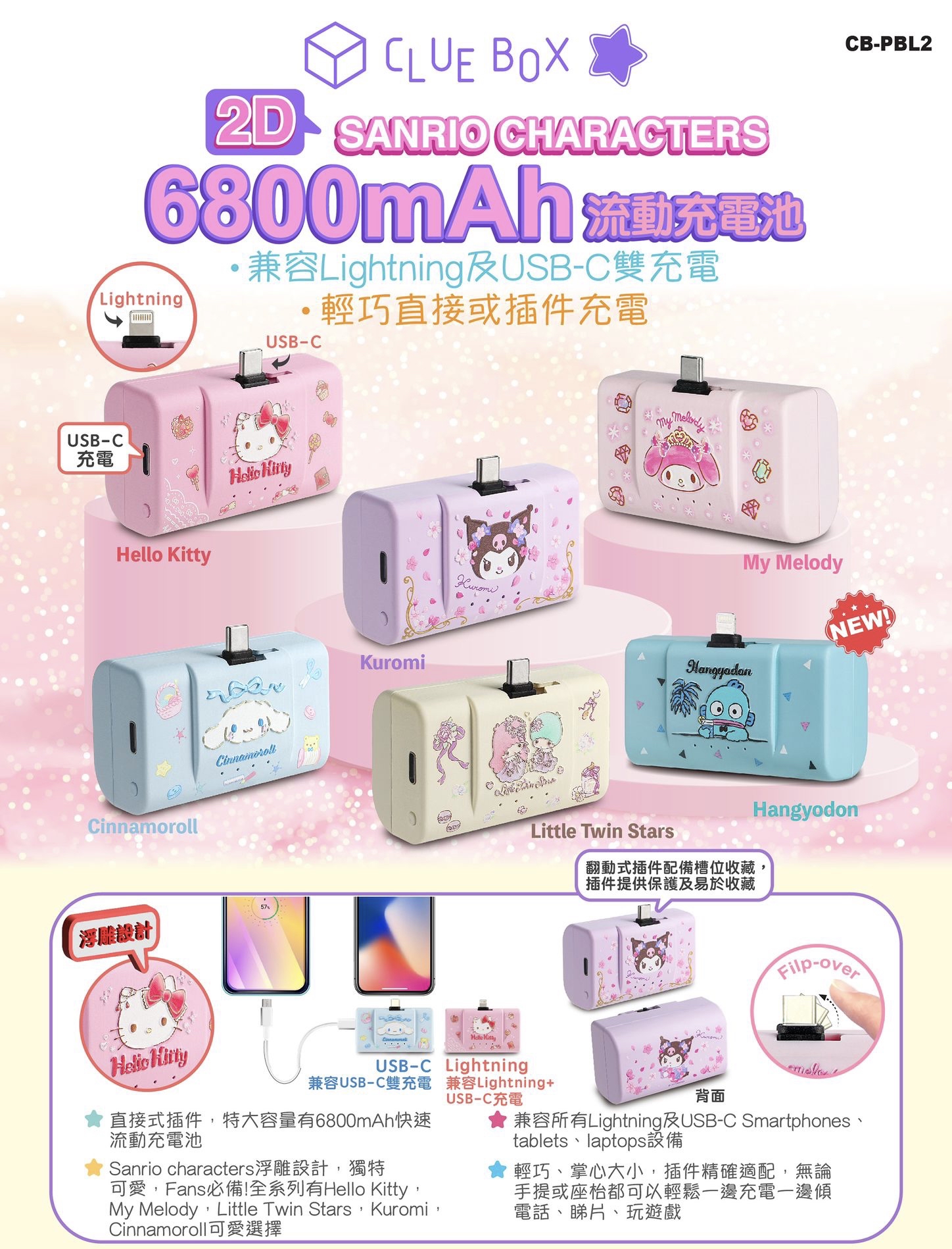 ‼️現貨發售‼️ 🎀Clue Box x Sanrio 6800mAh 快速流動充電池 超靚😍 📍網上24小時自助下單👍🏻 #立即下單:🌐 💥 兼容Lightning & USB-C同時雙充 💥 直插式充電 💥 輕巧手掌心大小 💥 一邊充電一邊輕鬆傾電話 💥 獨特Sanrio Characters 2D設計 ✅ 提供兩個不同款式,加強應用範圍💪 1️⃣ Lightning 版本 Lightning 直接式插件充電 ➕USB-C port 雙充電 2️⃣ USB-C 版本 USB-C 直接式插件充電 ➕ USB-C port雙充電 ✅ 人氣直插式充電,無需電線、額外方便、廣受歡迎!😘 ✅ 加上了新的翻動式插頭設計 - 備用時,插頭收藏在糟內;使用時,只須手指輕輕一剔,翻開插頭便可使用!輕輕一推,插頭便翻動到糟內收藏!提供足夠保護同時易於𢹂帶! ✅ 兼容所有Lightning 及USB-C設備,功能專業 、可靠千祈唔好錯過呀👏😍 累積經驗、不斷改進、鑽研 👍💯 全新特大容量6800mAh 快速充電池 分別有Kitty,Melody,Little Twin Stars,玉桂狗,Kuromi ,大口仔及水怪可供選擇 🔻🔻🔻🔻🔻🔻🔻🔻🔻🔻🔻🔻🔻🔻🔻 ⚠️所有貨品一經落單,不接受任何理由退款/取消/更改,敬請慎重考慮清楚才下單。 ⚠️ 圖片可能因顯示器不同而出現色差情況,所有商品皆以實物為準。